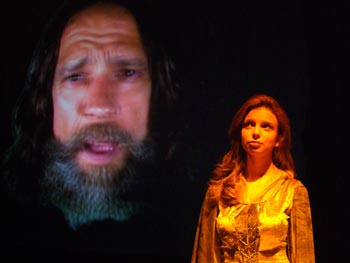 Another character with heavy virtual interplay is Caliban (played by Jason Mercury), the misshapen offspring of a powerful witch. Mercury slithers across the stage like a loose muscle. With his scaly, leopard-patterned body and rasta locks of plastic-coated cables that light-up green and hot red (at those special moments). He seems to manipulate objects onscreen (as tech hand John Wilson manipulates the virtual objects with a joystick), floating them around in space. Mercury says “As actors, we have the imagination that we use to create those objects in our mind, and we mime…we use our craft to create the objects for our audience, along with the 3-D [virtual] ones.”